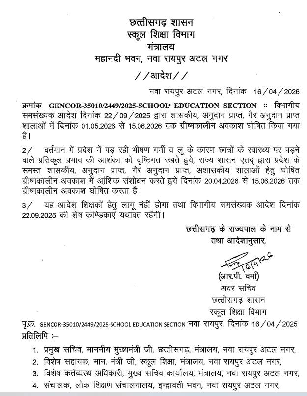 स्कूल शिक्षा विभाग, मंत्रालय महानदी भवन, नवा रायपुर अटल नगर द्वारा जारी आदेश के अनुसार पहले 1 मई से 15 जून तक घोषित अवकाश में संशोधन किया गया है। अब यह अवकाश 20 अप्रैल से 15 जून 2026 तक प्रभावी रहेगा। यह आदेश प्रदेश के सभी शासकीय, अनुदान प्राप्त, गैर अनुदान प्राप्त और निजी स्कूलों पर समान रूप से लागू होगा।